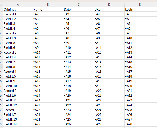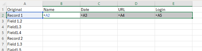3. In B2, I enter the formula =A2. In C2, enter =A3, in D2 enter =A4. Continue for each row that belongs to the first record or to the longest record if data is not the same length or there are blank rows between some or all records.