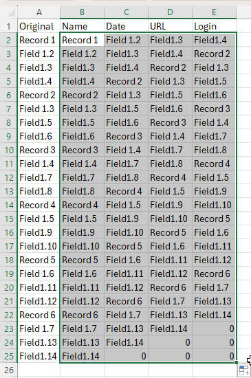 Note: if the records do not have the same number of fields as in my example, add enough columns to cover all values for the largest record or for blank rows between records. If the records have the same number of rows between each record, you can add a column to count the rows per record and sort by it (see last screenshot).