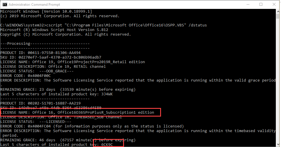 cscript "C:\Program Files\Microsoft Office\Office16\OSPP.VBS" /dstatus - The Command windows will list the licenses installed on your computer, showing you the last 5 characters of the product key linked to the license. The subscription version will say 'subscription' in the name.