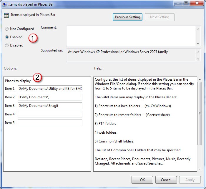On the right side of the policy editor, double click on Items displayed in the Places Bar.